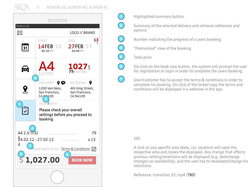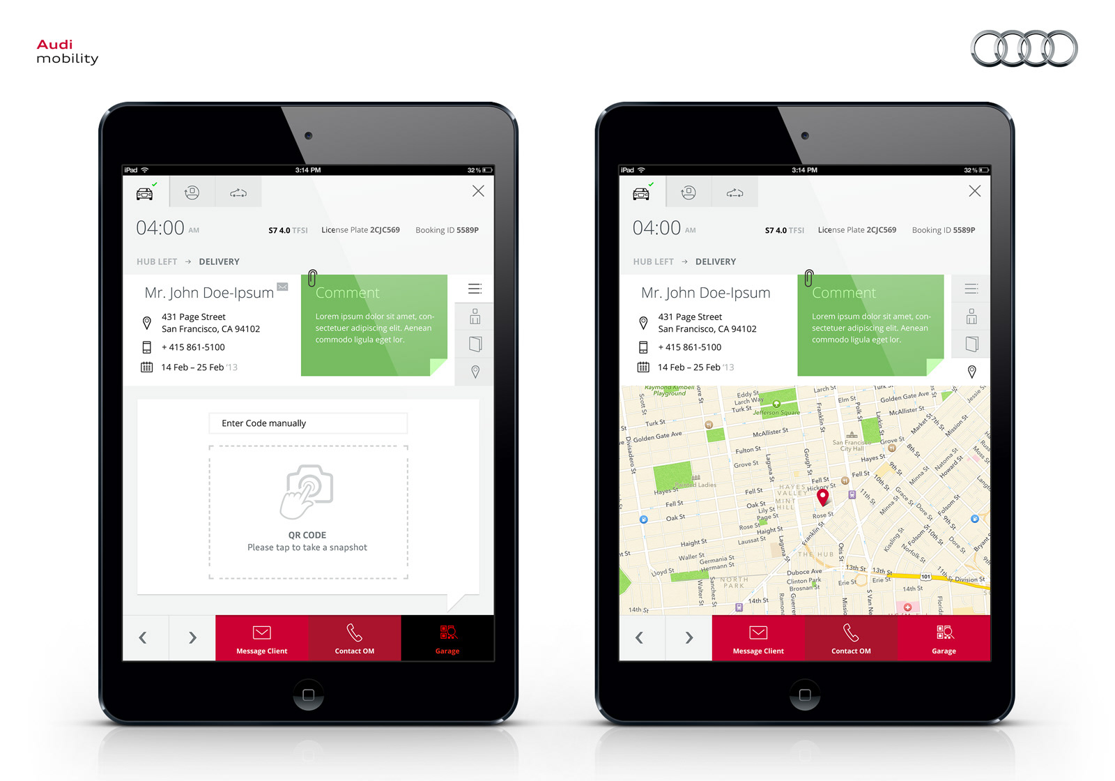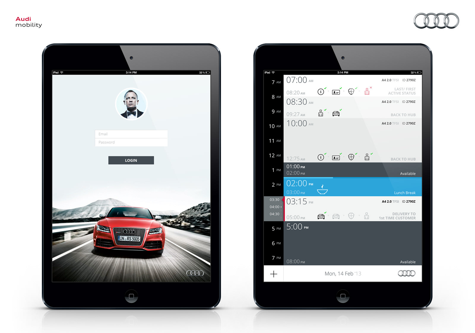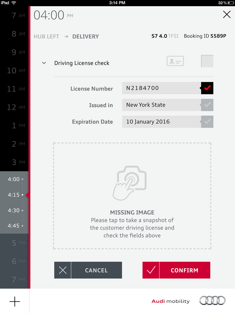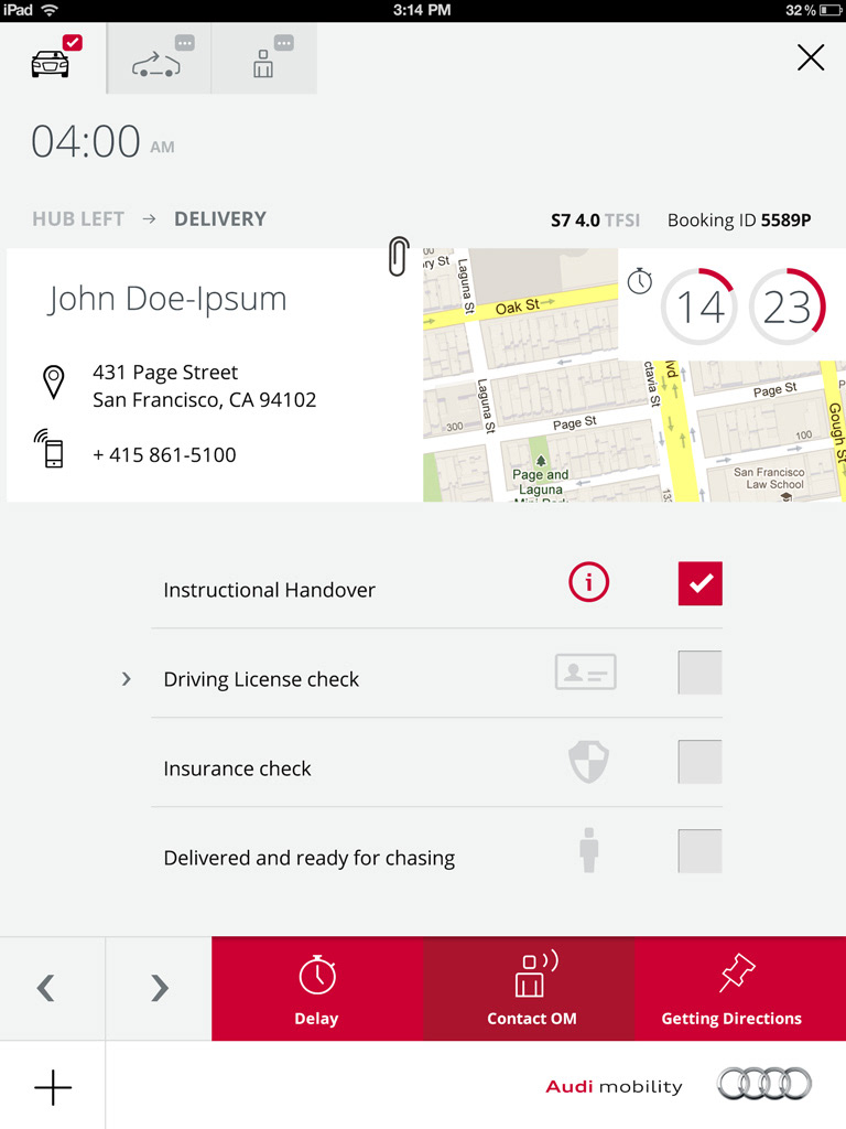 New premium service for Audi USA. This service inherited in car integration / communication with mobiledevices (starting the car within a mobile app, opening, closing, alarm, including parking/payment systems in the car + app). I was lead UX on that project. Beside the mobile app for the customer I also developed the iPad app for the Service which was used as a task planning/coordinating platform. Main goal of the project was also the seemless integration of incar informations (telemetrics) with the planning tools, backend, etc. We worked with 6 different types auf Audi models, and every model had it´s own limitations, systems.