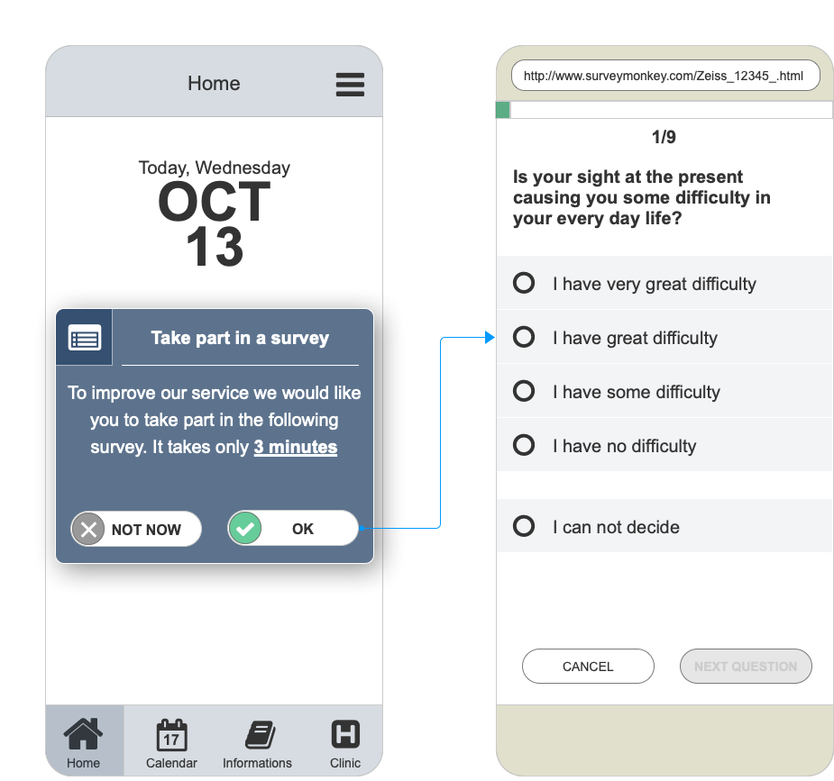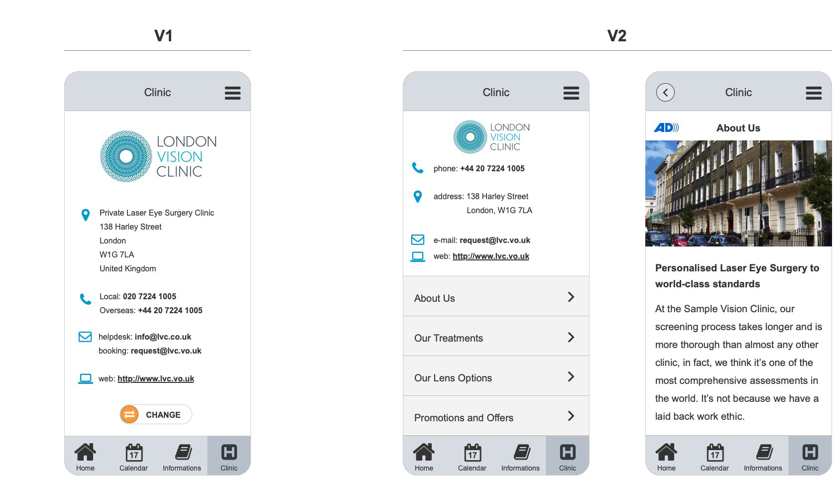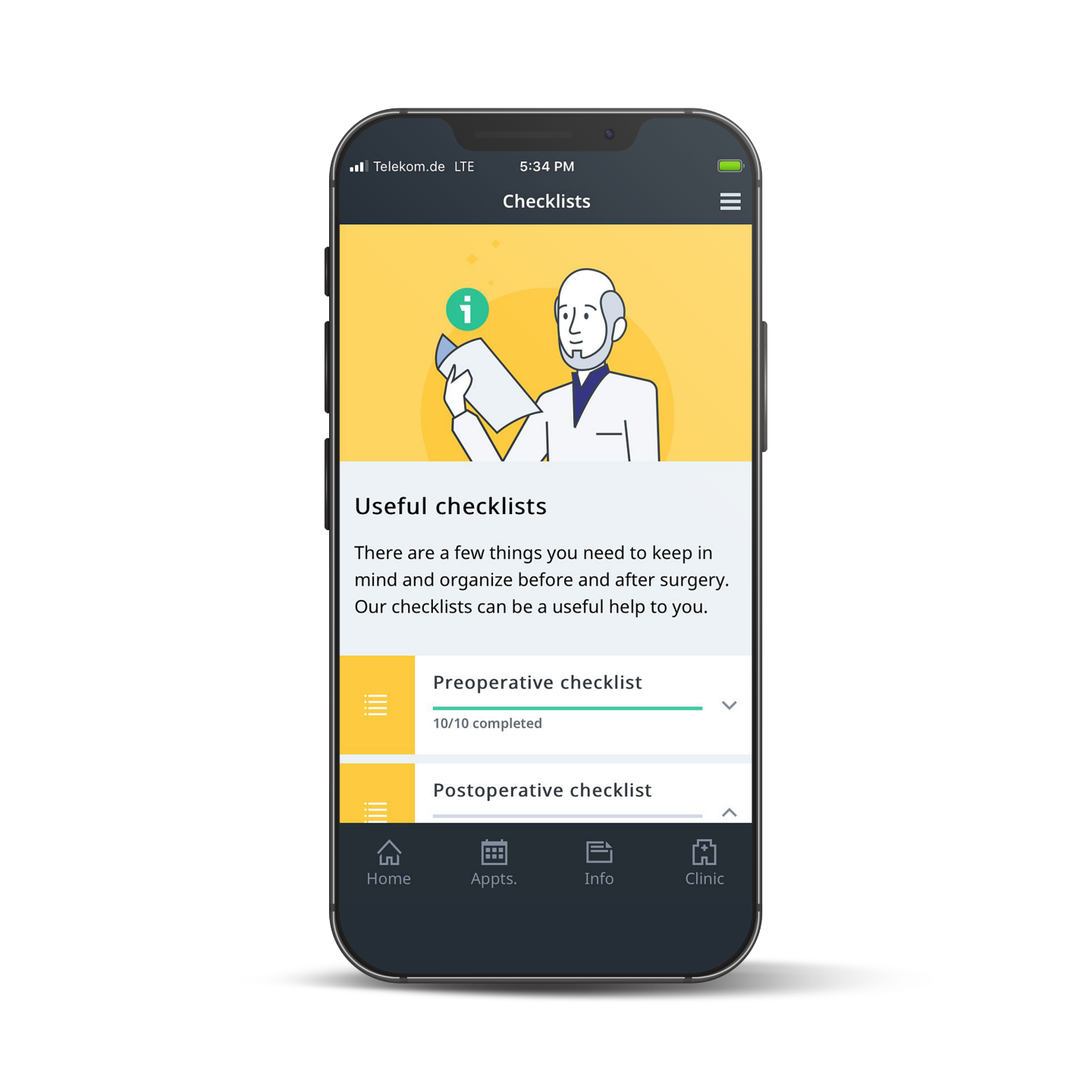 Within the app the patients are able to manage their appointments, manage their eye drops, smart checklists before and after surgery, neural text to speech engine, communication with their doctors/clinics. Beside that the doctor/clinic can create and manage their own space within the app. Appointments + medication can be pushed to the patients, to give them more comfort. During the development I also conducted various research stages, to test and improve features with existing patients. On top I also created an admin interface for the clinics, where they can manage all the content they provide to the patients. The app was successfully launched in September 2021. Based on the results and feedback of the app I also created a more interactive version for refractive patients. Refractive patients are younger and more interactive then the cataract patients, so the challenge was to find a creative and smart way to use the architecture of the cataract app and build/adapt it for the new target group with new features - like an assistant chat bot for various tasks.